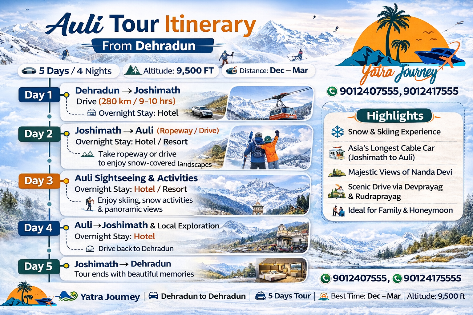 Experience the beauty of Auli with Yatra Journey, starting from Dehradun. Enjoy breathtaking Himalayan views, snow-covered landscapes, thrilling skiing adventures, and the famous Joshimath–Auli ropeway. This 5-day tour is perfect for couples, families, and adventure lovers looking for a refreshing mountain getaway. Explore serene surroundings, visit local attractions, and create unforgettable memories in one of India’s top winter destinations.
