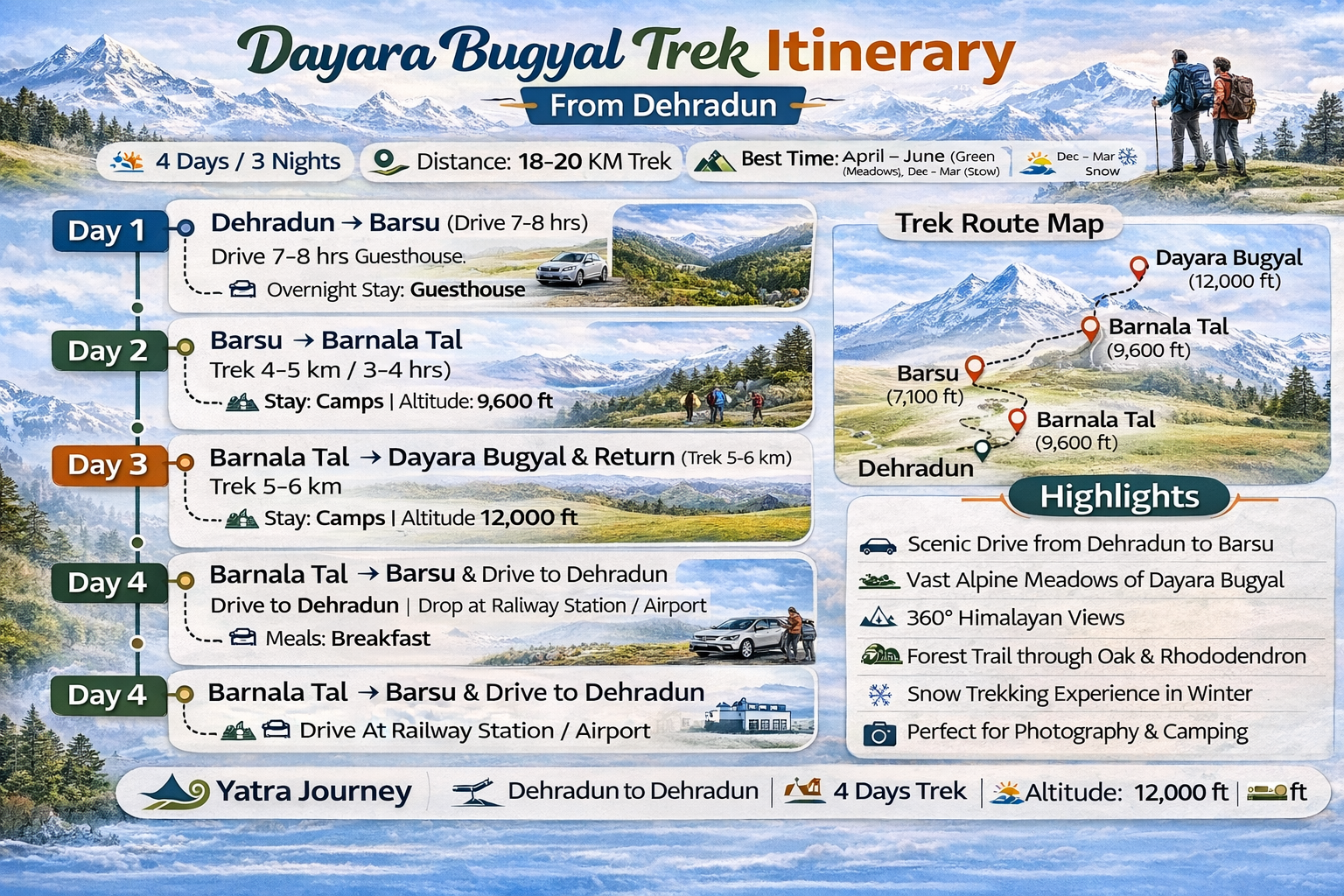 Looking for a peaceful Himalayan escape from Dehradun? The Dayara Bugyal Trek offers vast green meadows, stunning snow views in winter, and breathtaking Himalayan panoramas. Perfect for beginners, this trek takes you through dense forests, serene lakes, and wide open grasslands, making it an unforgettable nature experience for couples, families, and solo travelers.