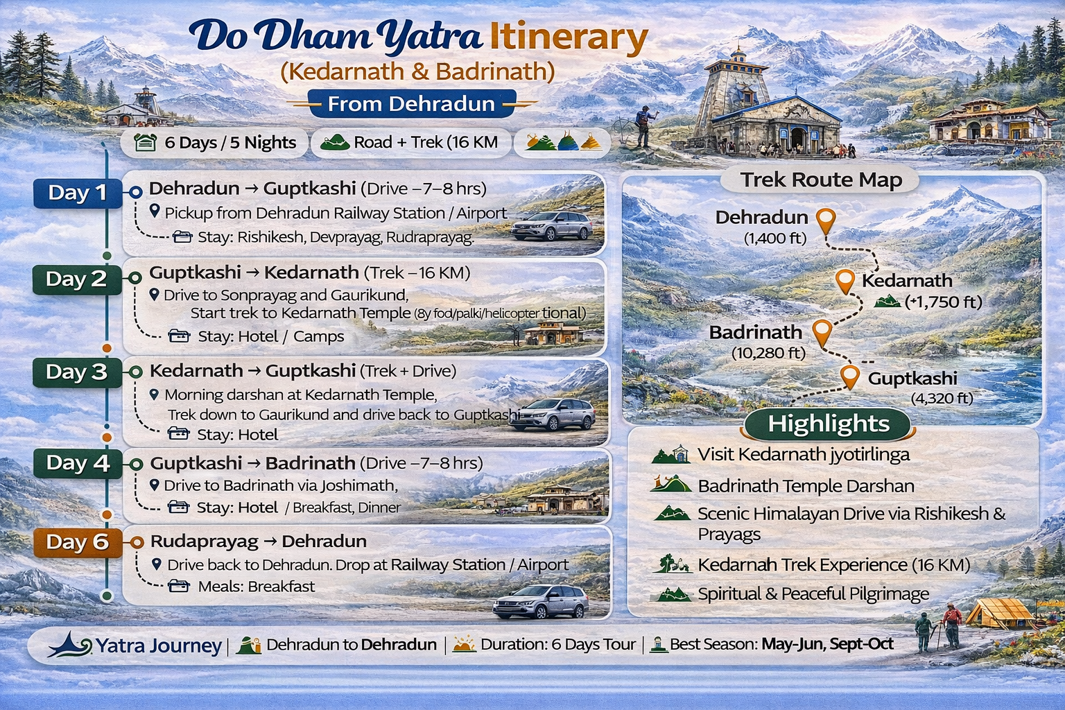 Do Dham Yatra from Dehradun with Yatra Journey. Visit Kedarnath Jyotirlinga and Badrinath Temple with a well-planned itinerary, comfortable travel, and a spiritually enriching Himalayan experience.