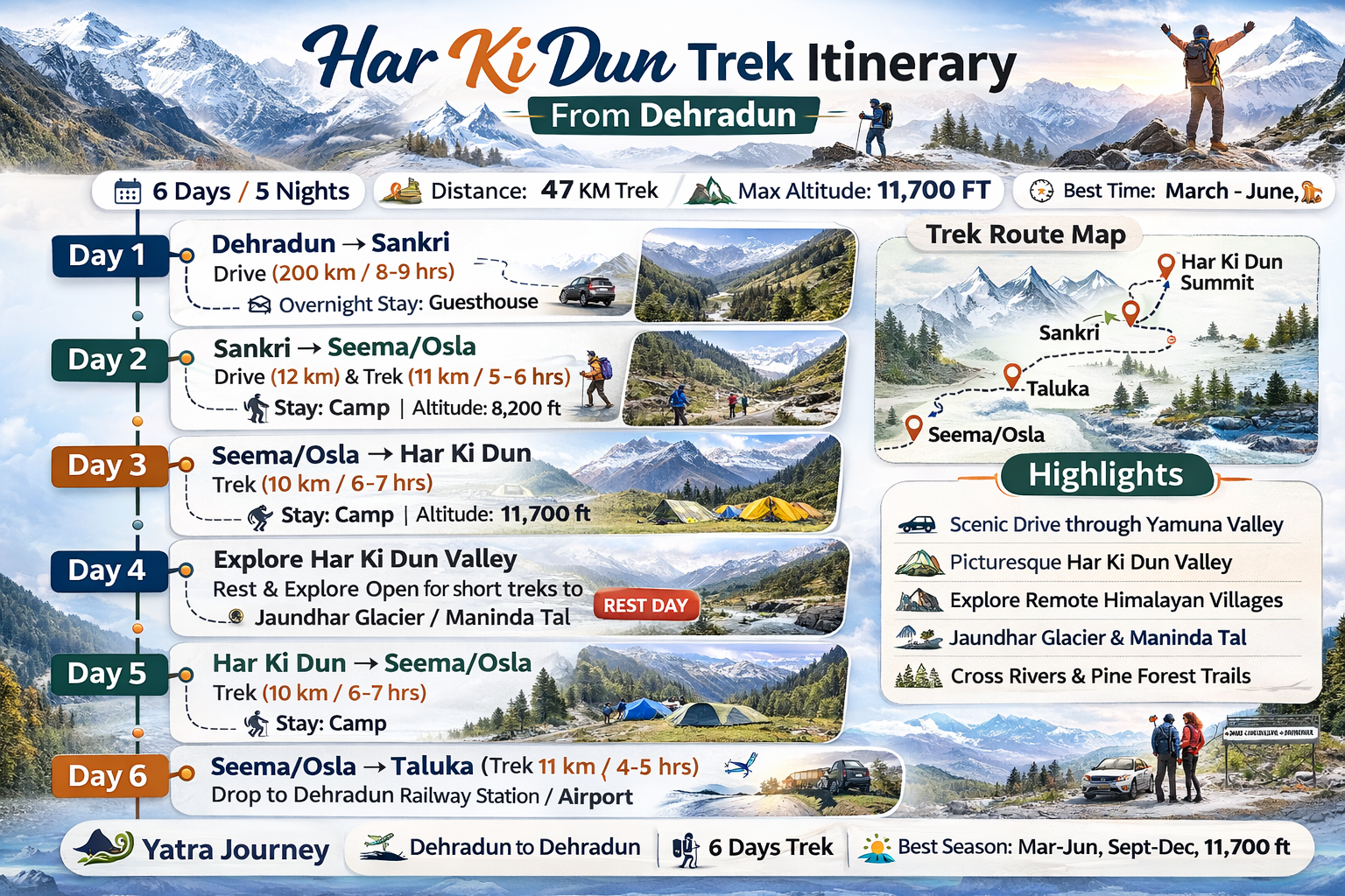 Har Ki Dun Trek from Dehradun by Yatra Journey offers an unforgettable adventure through the scenic valleys of Uttarakhand. Explore ancient villages, lush forests, and breathtaking Himalayan views while experiencing the beauty of nature and local culture on this guided trekking journey.