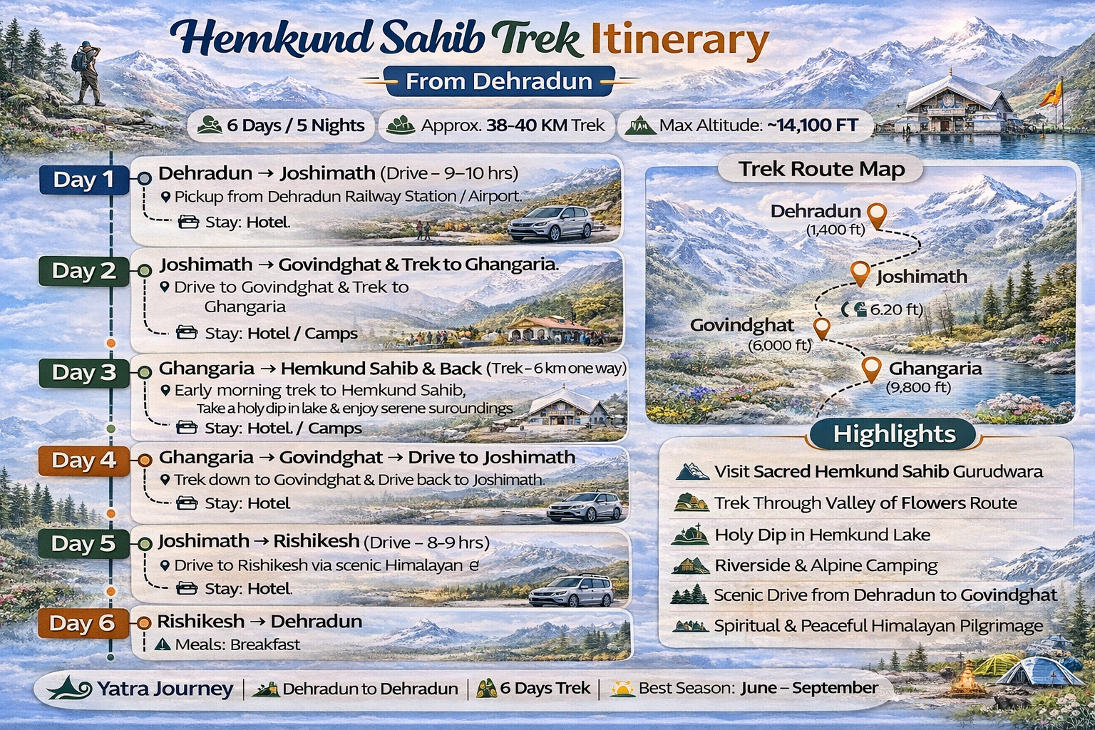 Experience the sacred Hemkund Sahib Trek from Dehradun with Yatra Journey. Visit the holy Gurudwara at 14,100 ft, surrounded by snow peaks and a serene glacial lake, offering a perfect blend of spirituality and Himalayan beauty.