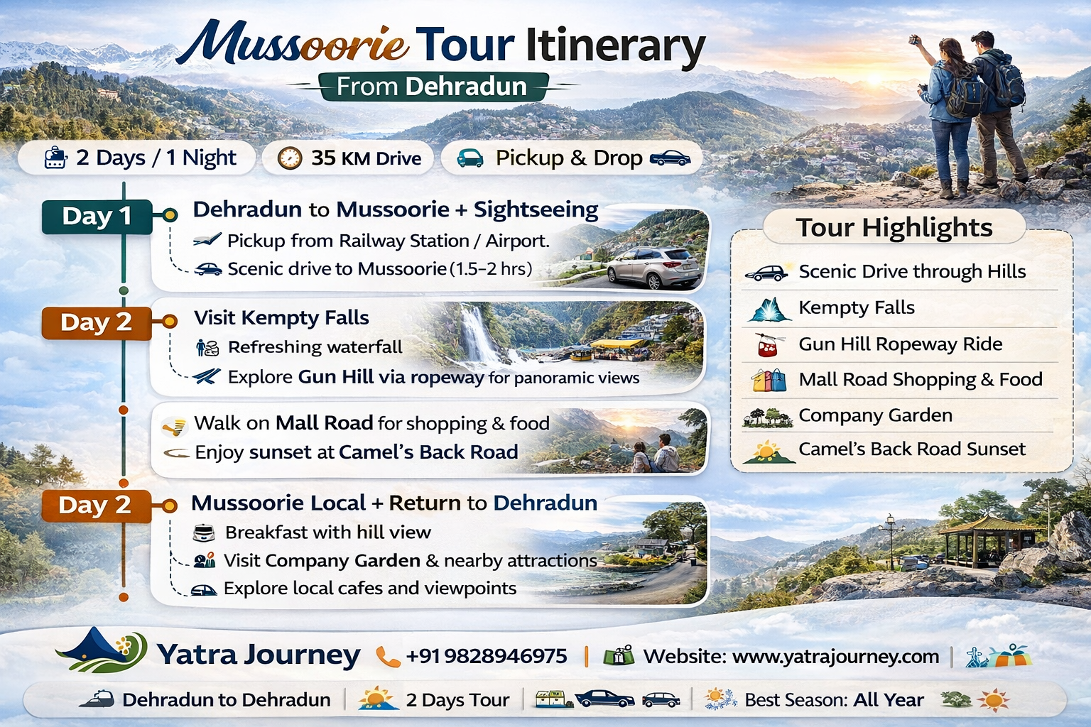 Experience a refreshing getaway to Mussoorie, the Queen of Hills, just a short drive from Dehradun. Enjoy scenic mountain views, Kempty Falls, Mall Road shopping, and peaceful surroundings. This 2-day tour is perfect for families, couples, and weekend travelers looking for relaxation and nature.