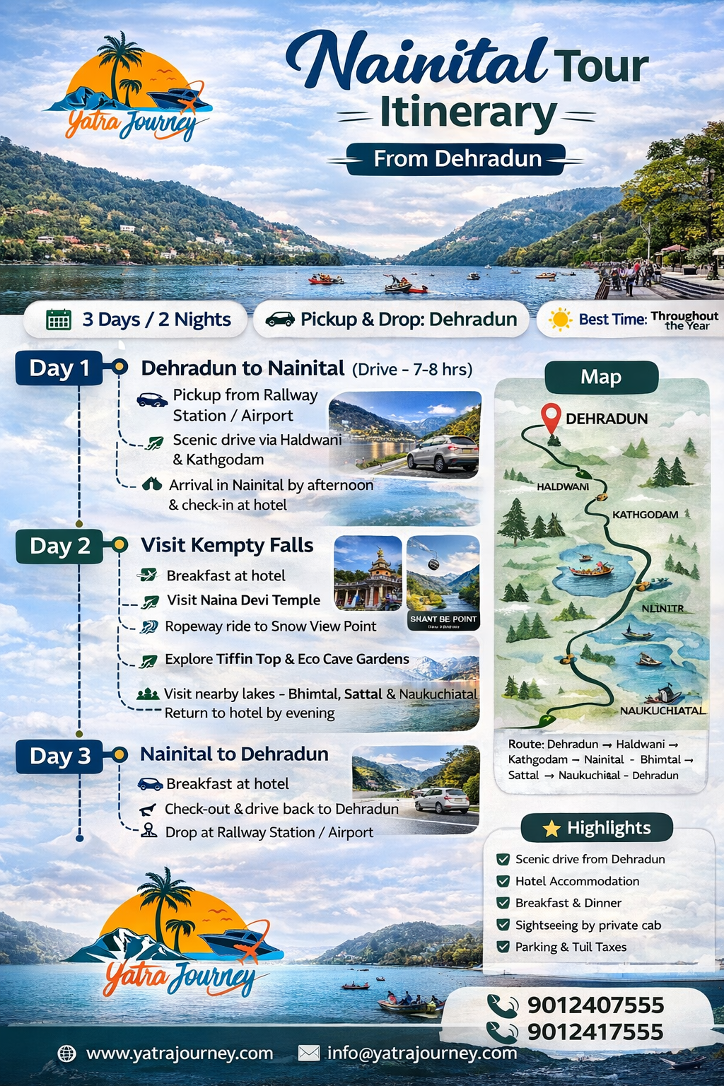 Experience a refreshing getaway to Nainital from Dehradun with Yatra Journey. Explore the serene Naini Lake, scenic viewpoints, temples, and nearby lakes like Bhimtal and Sattal. Perfect for families, couples, and weekend travelers seeking nature, peace, and adventure in the hills.