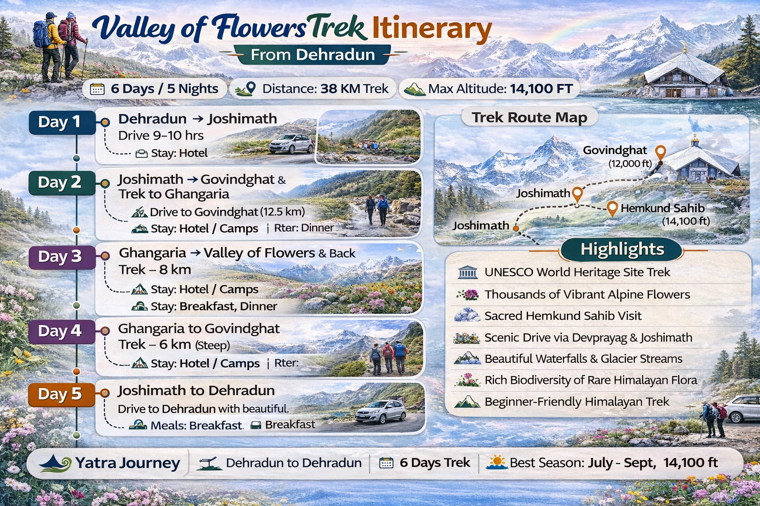 Experience the magical beauty of the Valley of Flowers Trek from Dehradun with Yatra Journey. This scenic Himalayan trek takes you through lush green valleys, waterfalls, and vibrant alpine flowers. Explore the UNESCO World Heritage Site and visit the sacred Hemkund Sahib. Perfect for beginners, couples, families, and solo travelers, this trek offers breathtaking landscapes, peaceful nature, and unforgettable memories in the lap of the Himalayas.